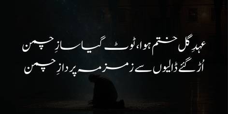 Lekin maiñ (Iqbāl) iss sārī tabāhī aur zawāl se mukammal taur par māyūs nahīn hūñ, balkeh ab sirf yeh ārzū hai ke Khudā kare koi shakhs merī iss dard bharī faryād ko sun’ne kī koshish kare aur uss par amal pairā ho.