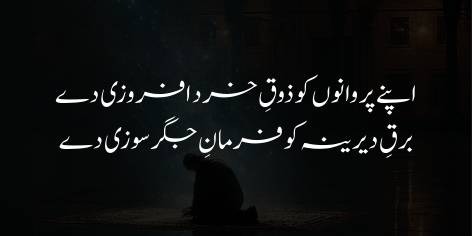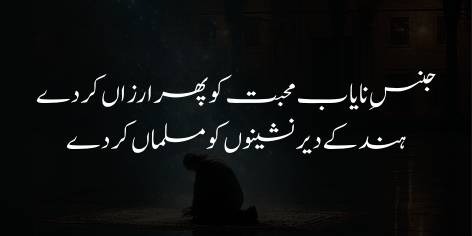 Shā’ir du’ā aur guzārish karte hue kehtā hai ke Ay Khudā! Apne un chāhne wālōñ (Musalmānōñ) mein phir se amal aur jad-o-jahd kā ek nayā jazba aur walwala paidā kar de, tāke woh dobārah fa’āl ho kar iss duniyā mein surkh-rū (kāmyāb aur bā-izzat) ho sakeñ. (Yeh shikwe ke ba’d ummeed aur du’ā kā pehlū hai, jiss kā jawāb “Jawāb-e-Shikwa” mein miltā hai).