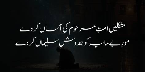 Shā’ir intehāī ‘ājizī aur iltijā ke sāth du’ā kartā hai ke Ay Rabb-e-Karīm! Tū khūb dekhtā hai ke woh Ummat jise tū ne hamesha apnī ‘ināyatōñ aur meherbāniyōñ se nawāzā, woh āj kitnī mushkilāt aur āzmā’ishōñ mein mubtalā hai. Lehāzā, tū un kī mushkilēñ āsān kar de.