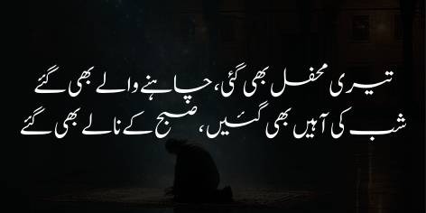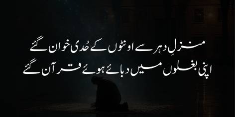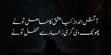 Shā’ir kehtā hai ke tere un chāhne wālōñ (‘ushshāq) ne tujhe apnā mehboob banāyā aur uss kī mohabbat kā sila bhi (apnī qurbāniyōñ kī sūrat mein) hāsil kar liyā. Lekin unke iss daur (‘urūj-o-iqtidār kā zamāna) kī muddat itnī mukhtasar rahī jaise koi shakhs kisī mehfil mein abhi ā kar baiṭhā hi ho aur fōran hi usay wahāñ se uṭhā diyā jā’e yā nikāl diyā jā’e (ya’ni Musalmānōñ ke ‘urūj kā zamāna tezī se khatm ho gayā).