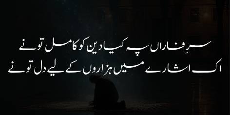 Shā’ir kehtā hai ke Ay Khudā! Tū ne Fārān kī choṭī par Paighambar Muhammad Sallallāhu ‘Alaihi Wasallam ke Deen (Islām) kī takmīl kī. Terī qudrat itnī zabardast hai ke ek ishāre par hazārōñ log tere girwīdah (mān’ne wāle) ho ga’e, aur tū ne apnī mohabbat (‘ishq) ke zariye insānī dilōñ ko apne qābū (maskhar) mein kar liyā.