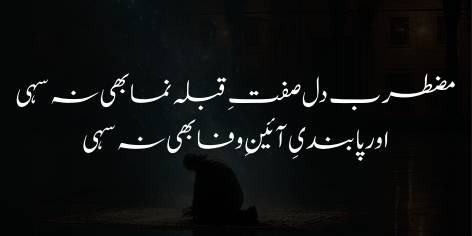 Shā’ir apnī maujūdah kamzōriyōñ kā i’tirāf jārī rakhte hue kehtā hai ke yeh bāt bhī durust hai ke hamāre dil ab Qibla numā (compass) kī tarah muztarib (be-chain aur muntashir) hain (ya’ni yak-sū’ī khatm ho chukī hai), aur yeh bhī haqeeqat hai ke ham pehle jaise wafādār bhī nahīn rahe. Na hi ham mein wafādārī ke usūlōñ (ā’īn kī pābandī) ko ba-qarār rakhne kā woh bharpūr jazba pehle kī tarah maujūd hai.