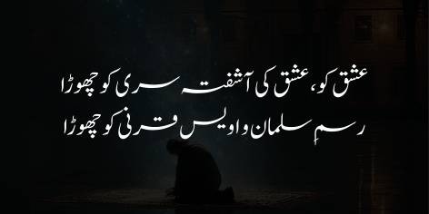 Shā’ir mazeed sawāl kartā hai ke kyā ham ne ishq (ya’ni ishq-e-Haqeeqī) aur ishq kī dīwāngī (wālehāna-pan) se kināra kashī kar lī (dūr ho ga’e) hain? Kyā ham ne Hazrat Salmān Fārsī (jo jihād aur ilm mein mash’hūr the) aur Hazrat Uwais Qarnī (jo ishq-e-Rasūl ﷺ aur zuhd ke liye jāne jāte the) kī riwāyāt ko tark kar diyā hai? (Ya’ni kyā ham ne woh jazba aur walwala chhoṛ diyā hai jo hamāre aslāf kā shi’ār thā?)