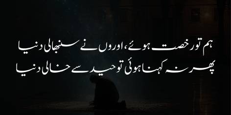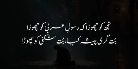 Shā’ir intehāī be-chainī se pūchhtā hai ke bas itnā batā de ke kyā ham ne terī ‘ibādat ko chhoṛ diyā hai? Yā kyā ham ne Huzoor (Hazrat Muhammad ﷺ) kī mohabbat se muñh moṛ liyā (ro-gardānī kī) hai?