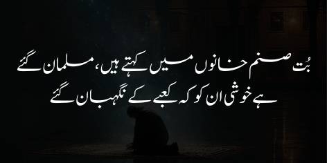 Shā’ir kehtā hai ke agarche ‘āshiq (Musalmān) rukhsat ho ga’e, lekin Ay Khudā! Laila (terī zāt kī mohabbat) kā dard āj bhi waisā hi hai, aur Majnūñ (‘āshiq) kā pehlū (jiss mein woh dard chhupā huā thā) bhi wohī hai.