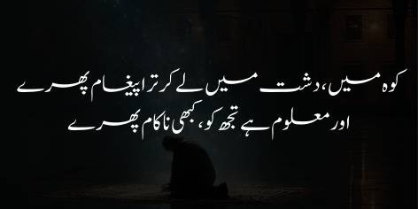 Yahāñ tak ke Sahrā-e-Najd mein āj bhi, māzī kī tarah, hiran khushī se chaukaṛiyāñ bharte phirte hain. (Murād yeh hai ke duniyā mein sab kuch maujūd hai, sirf ‘āshiq-e-sādiq miṭ gayā hai. Mahol aur jazba maujūd hai magar uss ko pūrā karne wālā nahīn.)