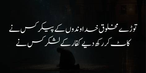 Shā’ir intehāī dukh aur shikwa ke sāth kehtā hai ke Ay Khudā! Jo log terī ta’līmāt ko jhuṭlāte (nafī karte) hain aur tere Deen ko tabāh-o-barbād karne kī koshish mein lage hue hain, tū ne un ko to ‘aish-o-masarrat ke tamām sāmān farāham kiye hue hain.