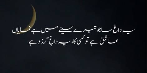 تیرے سینے پر جو داغ (دھبہ) نظر آتا ہے، اسے دیکھ کر یوں محسوس ہوتا ہے کہ یہ داغ کسی کی گہری چاہت اور آرزو کا مظہر ہے۔ اور یہ بھی کہ (اے چاند) میری ہی طرح تو بھی کسی کے عشق میں مبتلا اور گرفتار ہے۔