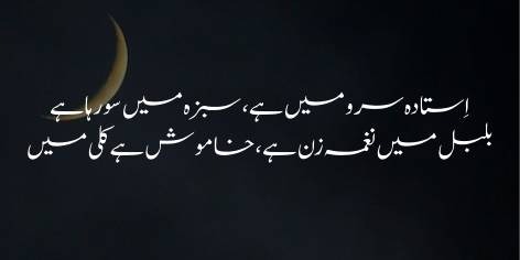 Phir yūñ bhi hai ke kahīn uss shai ka wujood bulbul mein naghme ki shakal mein jalwa-gar hai, jabkeh kali ke baṭn (andar) mein woh mukammal khāmoshi (sukūt) ban kar chuppā huā hai.