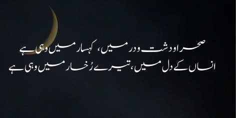 Chunānche, sirf yehi nahīn, balkeh uss husn ka jalwa to sehrā’ōn (registānōn) aur kohsārōn (pahāṛōn) mein bhi poori tarah se maujood hai. Yeh insān ke dil mein bhi hai aur (Ay chānd!) tere chehre par bhi yehi pur-kashish jalwa nazar ātā hai.