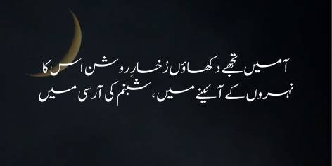 Sō ay chānd! Tū mere pās ā, tā-ke maiñ tujhe uss husn ke jalwōn (dīdārōn) se roshanās karā’ūñ (pehchān dūñ). Dekh to sahi! Yeh dilkash jalwa nadiyōn ke shaffāf pānī mein bhi maujood hai aur shabnam ke chamakdār qatrōn mein bhi sāf numāyāñ hai.