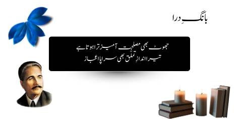 Ḥukmrānōñ kā darwāza aur un kī bārgāh (dar-e-ḥukkām) tumhāre liye aisā maqām ban cukā hai jaise wōh maqām-e-maḥmūd hō. Aur tumhārī siyāsī cālēñ aur ḥikmat-e-‘amalī (pālsī) bhī Sulṭān Maḥmūd ke ġhulām Ayāz kī pēchīda zulfōñ se bhī zyāda uljhī huī aur mushkil hai.