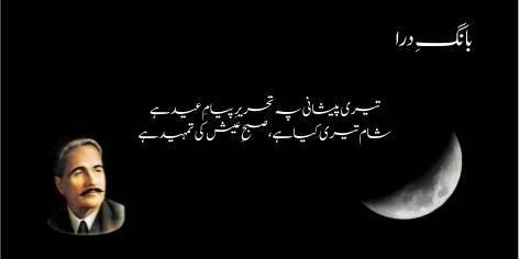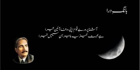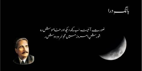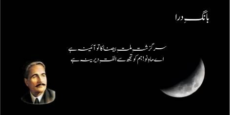Ttum ṣāf suthrī aur tābnāk millat-e-Islāmiyya kī pūrī tārīkh, us ke ‘urūj-o-zawāl kī kahāniyyōñ kā ek ‘aks aur ā’īna hō. Isī liye ai Māh-e-Nau! Hamārā aur tumhārā bahut qadīm aur gahrā jazbātī ta‘alluq (ulfat-e-dērīna) hai.