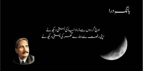 اب شاعر چاند کو حال کا منظر دکھاتے ہیں: اے چاند! تم اپنی آسمان کی بلندیوں (اوجِ گردوں) سے ذرا نیچے زمین پر بسی دنیا کی آبادیوں کو دیکھو۔ اور اپنی اس اونچائی اور عظمت (رفعت) سے، اس کے مقابلے میں، ہمارے (مسلمانوں کے) ٹھکانے اور گھروں کے زوال اور پستی کو بھی دیکھ لو! (یہ عظمت اور زوال کا ایک جذباتی موازنہ ہے)۔
