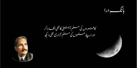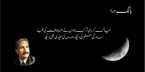 Āj Musalmān andarūnī ṭaur par kis ḥāl mein hain ke wōh āpas mein firqa parastī (firqa ārā’ī) kī mazbūṭ zanjīrōñ mein jakṛe hue qaidī (asīr) hain. Ai cānd! Tum tō tamām qaid se āzād hō, apnī āzādī kō bhī dekhō, aur in kamzōr Musalmānōñ kī andarūnī giriftārī aur ġhulāmī kō bhī dekhō.