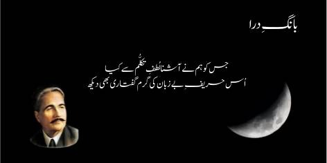 Wōh muḳhālif aur dushman (ḥarīf) jis kō ham ne hī (Musalmānōñ ne) bōl cāl aur shīrīñ guftgū (luṭf-e-takallum) ke salīqe se wāqif karāyā thā, āj usī (pahle ke) bē-zubān dushman kī tēz aur jōshīlī taqrīrēñ (garm guftārī) bhī dekhō, jo ab ham hī par ġhālib ā gayā hai.