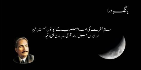 Ai cānd! Tum Maġhrib (Europe) ke shāndār maḥallōñ aur aivānōñ mein khushī aur ‘aish-o-ārām ke bājōñ kī āwāz (sāz-e-‘ishrat kī ṣadā) kō sunō. Aur us ke muqāble mein, ẕarā Mashriq mein Īrān kī ṭaraf bhī dekhō ke kis ṭaraḥ wahāñ tabāhī aur ġham kī wajah se mātam kī tayyārī hō rahī hai.