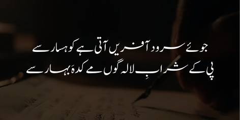 Yuñ mehṣūs hotā hai jaise yeh nadī kohsār (pahāṛ) ke maikade (sharāb khāne) se sharāb ke jām (bharpoor pānī) uṛā kar lātī hai, aur phir ūnche nīche maqāmāt se guzār kar khetōñ tak pahuñchātī hai aur yeh sharāb unhēñ pilā detī hai।
