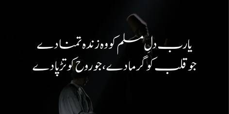 Iqbāl bārgāh-e-Ilāhī mein du’ā go hain ke Ay Mālik-e-Jahāñ! Musalmānōñ ke dilōñ mein aisī bedār tamannā’ēñ (jāgtī huī khwāhishāt, na’e maqāṣid) paidā kar jo har qalb ko muẓtarib (be-chain) kar de aur un kī rūḥ ko taṛpā kar rakh de।