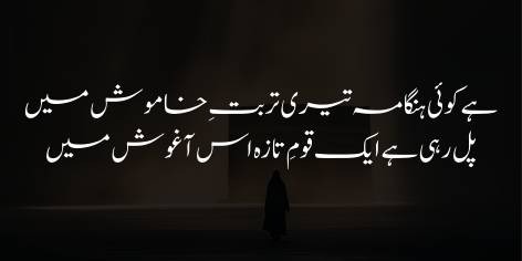 Yūñ meḥsūs hotā hai ke iss qabr kī āghōsh (gōd) mein ek na’ī aur zinda qaum parwarish pā rahī hai। Murād yeh hai ke Fāṭima kī qurbānī itnī tāqatwar hai ke un kī khāmōsh qabr bhī Millat ke liye ek paighām-e-ḥayāt hai; un kī shahādat, khāmōshī ke bāwajūd, ek baṛe inqilāb kī buniyād ban chukī hai jiss se ek na’ī, bedār aur bā-‘amal qaum janam le rahī hai.