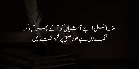 Murād yeh hai ke maujūda Musalmān ko apnī be-khabarī chhoṛ kar apne shāndār māzī ke ‘amalī uṣūlōñ ko dobāra apnānā chāhiye, aur un ḥaqā’iq par ghaur karnā chāhiye jo daur-e-ḥāẓir kā ṣāḥib-e-baṣīrat rahnumā (jaise Iqbāl) bayān kar rahā hai.