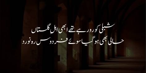 وہ کہتا ہے کہ شبلی (مولانا شبلی نعمانی، عظیم سوانح نگار اور نقاد) کی وفات نے ہمارے دلوں کو ریزہ ریزہ کر کے رکھ دیا تھا اور ہم اس المیے پر آنسو بہا رہے تھے، کہ (اسی دوران) مولانا حالی (خواجہ الطاف حسین حالی، عظیم شاعر اور مصلح) بھی اس دنیا سے کوچ کر کے جنت کو سدھار گئے۔