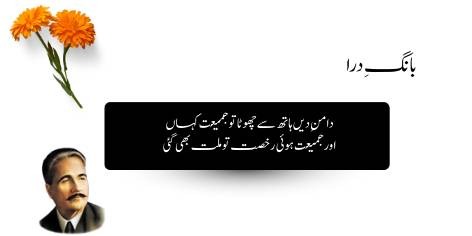 Yeh nuktaḥ zehen nashīn kar lō ke agar tumhāre hāth se dīn kā dāman chhūṭ gayā (ya’nī tum ne dīnī uṣūlōñ ko chhōṛ diyā) tō tumhārā qaumī ittihād aur yakjehtī (jam’iyyat) khatm ho jā’egī. Aur jab qaumī ittihād khatm ho gayā tō phir tumhārī pūrī qaum (millat) kā wujūd aur shinakht bhī miṭ jā’eg.