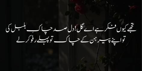 Iqbāl zer-e-tashrīḥ nazm mein phūl se mukālama karte hue kehte hain: “Ay Phūl! Bulbul kā dil agar kisī ke firāq (judā’ī) mein rēza rēza hotā hai, tō tujhe uss kī itnī fikr kyūñ hai? Ke tere libāde (pattōñ yā dāman) mein jō chāk (sūrākh/darāreñ) hain, pehle unn kō tō rafū (silā’ī) karne kī fikr kar.”