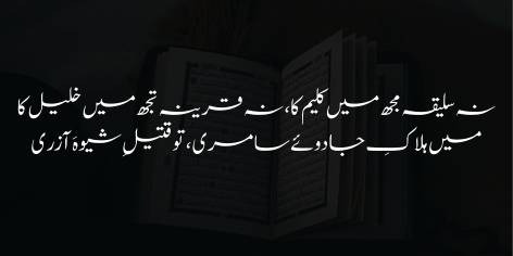 “Ay ‘Aṣr-e-Jadeed ke Musalmān! Maiñ dekhtā hūñ ke apnī tamām tar sukhanwarī (shā’irī, bāt chīt) ke bāwajūd mujh meñ Ḥaẓrat Mūsā kī Kalīmī (Allāh se barāh-e-rāst ham-kalām hōne kī ṣifat, rūḥānī ṭāqat) kā kō’ī ‘unṣur maujūd nahīn hai.”