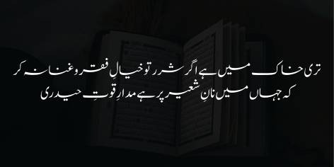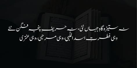 “Ay Musalmān! Agar tere wujūd meñ ghairat aur ḥamīyat (khud-dārī, ‘izzat-e-nafs) kī kō’ī chingārī bāqī rah ga’ī hai tō tujhe iflās (ghurbat) wō amārat (daulatmandī) kā khayāl hī nahīn karnā chāhiye.”