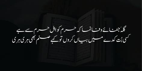 “دنیا بھر کے مسلمانوں سے کعبے کو جو شکایت ہے، اگر میں اس کا اظہار کسی بُت کدے (مندر یا غیر مسلم عبادت گاہ) میں کروں، تو وہاں رکھے ہوئے بت بھی اظہارِ ہمدردی کے طور پر ‘توبہ، توبہ’ کرنے لگ جائیں گے۔”