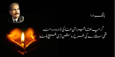 Tumhāre is kamzōr jism (nātavāñ paikar) mein kitnā bebāk aur be-khauf dil maujūd thā. Tumhārā wujūd muṭṭhī bhar rākh (musht-e-khākastar) jaisā thā, magar us mein āsmānōñ mein parwāz karne wālā sho’lah (sho’lah-e-gardūñ naward) pōshīdah thā.