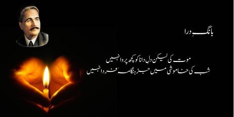 Lekin ‘aqlmand aur dānā dil (dil-e-dānā) ko maut kī bilkul bhī parvāh nahīñ hotī. Kyūñke woh jānte hain ke rāt kī khāmōshī (shab kī khāmōshī) ke pīche kal (fardā) ke hangāme aur raunaq ke sivā kuch nahīñ hai.
