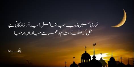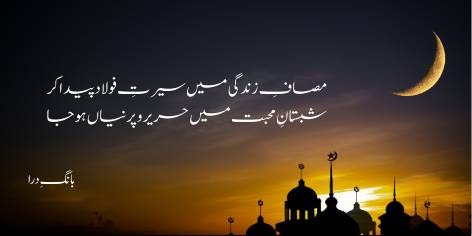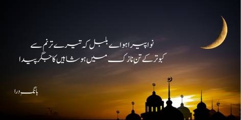 Ay Musalman! tere ilm aur teri muhabbat ki koi had nahi hai. Is kainat ke saaz mein tere wajood se zyada buland aur pyari koi awaz nahi hai. Tu hi is kainat ka behtareen hissa hai.