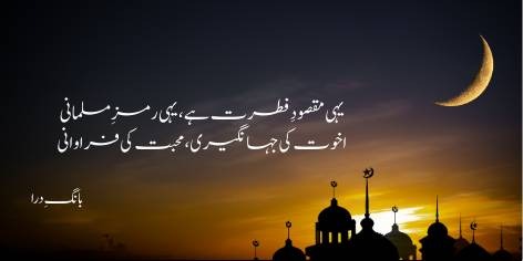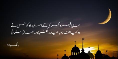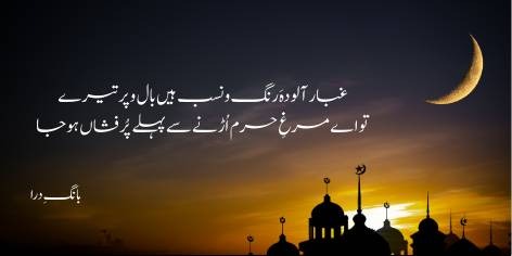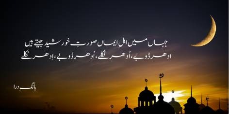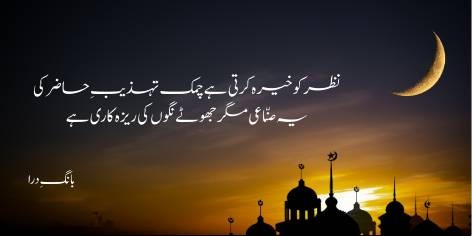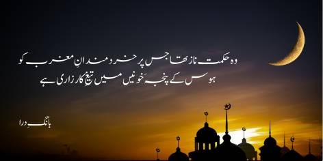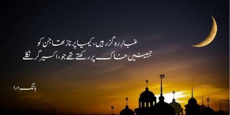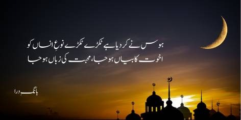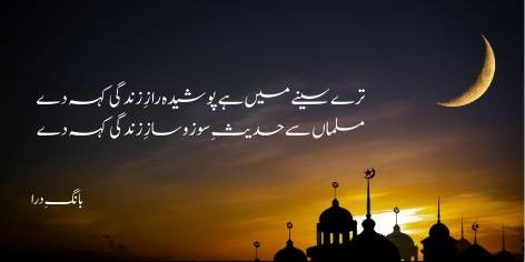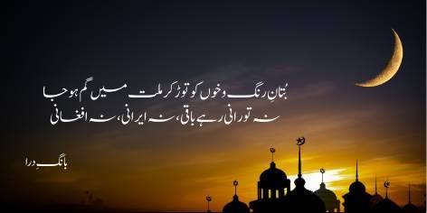 Ay Musalman! teri salahiyaton ko rang, nasl aur qabile ke taasubat ki gard ne dhaanp liya hai. Tu Kaba ka parinda hai, tujhe chahiye ke bulandiyon par urne se pehle apne paron se is taasub ki mitti ko jhatak de.