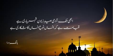 Yeh kitne afsos ki baat hai ke aaj ka insan ab bhi badshahatun aur amriyat ka sataya hua shikar hai. Yeh zulm ki intiha hai ke insan hi insan ka istehsal kar raha hai aur insan hi insan ka shikari bana hua hai.