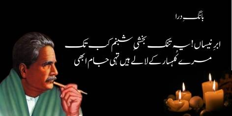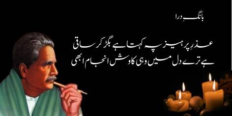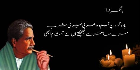 Log ghair-islami aur Maghribi afkar ki sharab pine ke aadi ho chuke hain. Meri sharab “Arabi” hai (yaani meri sha’iri khalis Islami talimat par mabni hai). Isi liye aaj ke daur ke pine wale (jadeed taleem-yafta naujawan) mere kalam ki haqiqat ko samajhne aur ise apnane se darte aur jhijakte hain.