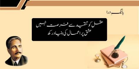 Aql ka kaam hi shak karna, nukta-cheeni karna aur nafa-nuqsan ka hisab lagana hai, woh tujhe kabhi amal nahi karne de gi. Is liye agar tu zindagi mein bare kaam karna chahta hai, to apne amal ki buniyaad “Ishq” (jazba aur junoon) par rakh. Ishq hi woh taqat hai jo aql ki uljhanon se nikal kar insan ko manzil tak pohanchati hai.