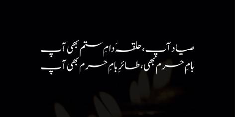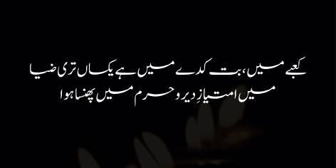 “Kya sitam ($Sitam$) hai ke main khud ko Haram (muqaddas maqām, roohāni bulandi) ki ūnchāi ($Bulandi$) bhi samajhta hoon aur uss par istādah parindah bhi”.