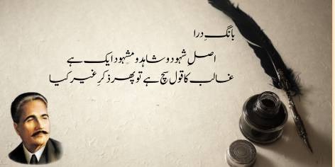Mirza Ghalib ka ek mashhoor misra hai: “Asl-e-shuhood-o-shahid-o-mashhood ek hai”. Is ka falsafiyana matlab yeh hai ke kainat mein jo kuch nazar aa raha hai (mashhood), dekhne wali aankh (shahid) aur dekhne ka amal (shuhood) sab haqiqat mein ek hi wajood (Khuda) ke mukhtalif roop hain. Iqbal tanziya sawal karte hain ke agar Ghalib ki yeh baat sach hai aur sab kuch ek hi hai, to phir kisi ko “ghair” ya “doosra” samajhne ka sawal hi kyun paida hota hai? Agar sab ek hain to phir doori kaisi?