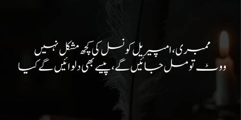 Iss iqtibās mein ‘Allāma Iqbāl ne jumhūrī niz̤ām kī iss bunyādī khāmī aur la’nat kī nishāndahī kī hai jō bīswīñ ṣadī se lē kar āj tak hamāre ma’āshare mein jūñ kī tūñ maujūd hai. Iqbāl farmāte hain ke assembly’ōñ aur council’ōñ ke intikhābāt maḥz ek aisā khēl ban chuke hain jahāñ ṣirf Sarmāyā-dār ṭabqa hī ḥiṣṣa lēne kā ahal samjhā jātā hai. Yeh niz̤ām-e-intikhāb ‘awāmī falāḥ ke bajā’e vōter’ōñ kī kharīd-o-farōkht par mabnī hai.