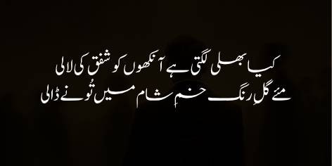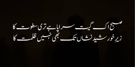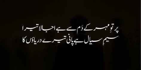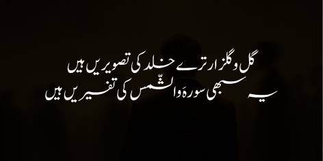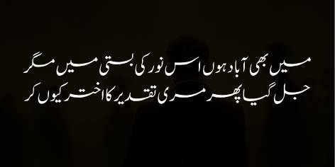 “Teri iss noor se bhari basti (dunya) mein, har chand ke main (insaan) bhi rehā’ish pazeer hoon, lekin iski kya wajah hai ke meri qismat ka sitāra, iss azeem roshni ke bāwajood, khud roshni se mehroom hai?”