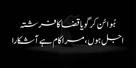 Ishq ke farishte ke sawāl ke jawab mein Malik-ul-Maut (Maut ke farishte) ne kahā: “Hairat hai ke tū abhi tak meri zāt aur mere wajood se wāqif (āshnā) nahin hai?”