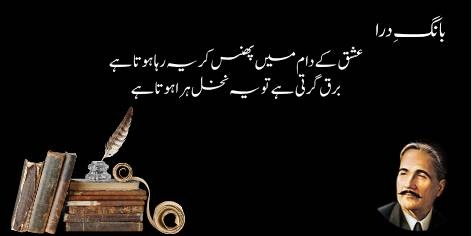 Allama Iqbal ishq kī mutaẓādd aur mo’jizātī ta’ṣeer bayān karte hain: “Ishq ke dām (jāl yā phande) mein jo shaḳhṣ phans jātā hai (giriftār ho jātā hai), woh apnī rūḥānī kaifiyat kī binā par, is qaid ke bāwajood khud ko pūrī tarah āzād samajhtā hai.