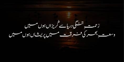 “Amr-e-Wāqi’a (haqeeqat) yeh hai ke main jo fitri taur par wasee’ ul-mashrab (āzād aur kushādah fitrat) hoon, iss liye daryā ki tangi dāmāni (mehdood jagah aur tangi) se nijāt hāsil karne ki khwāhāñ (chāhne waali) rehti hoon”.