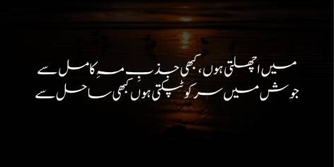 - “میں کبھی تو چودھویں رات کے چاند کی کشش کے زیرِ اثر مد و جزر ( سمندر کے پانی کا چڑھنا اور اترنا) سے ہمکنار ہوتی ہوں”، (یعنی پرسکون رہتی ہوں)، “اور کبھی جوش و خروش کے عالم میں ساحل کے کناروں سے ٹکراتی اور اپنا سر پھوڑتی ہوں”