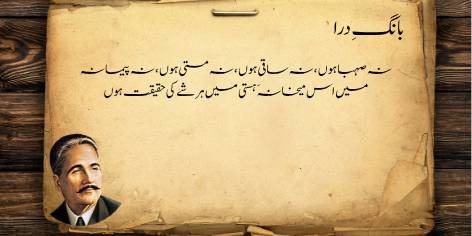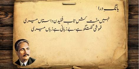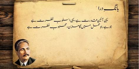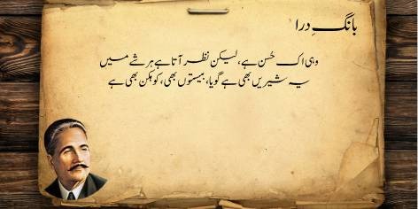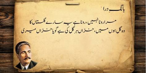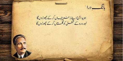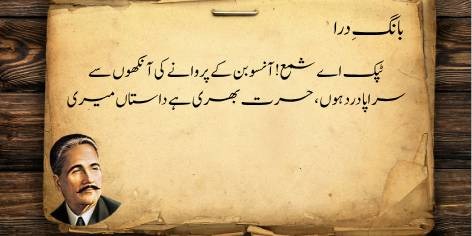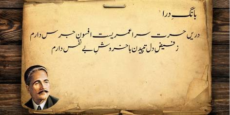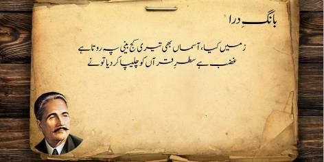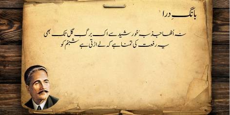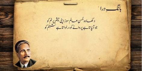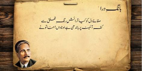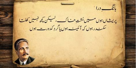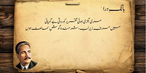 Is sāre pas manzar mein (qaum kī be-amalī aur zawāl kī ṣūrat-e-ḥāl mein) yeh ahem sawāl uṭhtā hai ke jab watan aur ahl-e-watan kī be-amalī (sustī aur amal se dūrī) apne intihā’ī ‘urūj aur bulandī par ho, toh ek bā-shu’ūr (samajh dār) aur ġhairat mand taḳhlīq kār (shā’ir, dānishwar) yeh sōchne par majbūr ho jātā hai ke…”