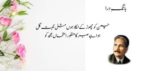 Maiñ bāġh (waṭan yā ārām deh jagah) ko chhoṛ kar phūl kī khushbū kī tarah (be-chain aur be-qarār hō kar) niklā hūñ. Mujhe ṣabr aur istiqāmat kā imtiḥān denā manẓūr huā hai.