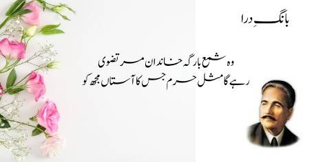 وہ حضرت علیؓ کے خاندانِ پاک کی بارگاہ کی شمع ہیں۔ ان کا آستانہ (دروازہ یا دہلیز) میرے لیے ہمیشہ حرم (مکہ کی مقدس جگہ) کی طرح مقدس رہے گا۔
