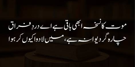 Shā’ir kehte hain ke mehboob se hijr-o-firāq kā mudāwā (remedy for separation) shāyad mere chārah-gar (healer or confidant) ke nazdeek koī ahmiyat na rakhtā ho, lekin main yeh samajhtā hūn ke maut hī is kā haqīqī mudāwā hai.